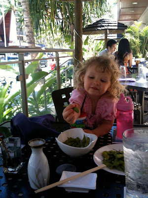 9. Also on Tuesday (Jane & I were rollin' solo that day) we ate a super delicious lunch on the patio at Roy's. She's showing off the seasoned edamame that she pretty much ate all of by herself.
